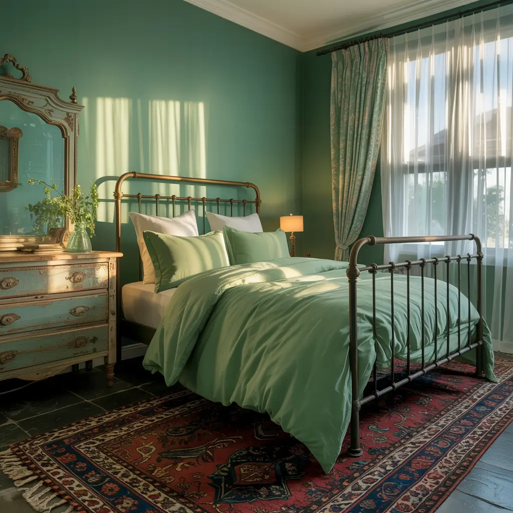 Embrace pattern play with this combination. Vintage-inspired wallpaper featuring both colors, or mix different patterns in your textiles. A teal headboard with kelly green bedding? Absolutely! The vintage aesthetic gives you permission to be a bit more playful with your color placement.