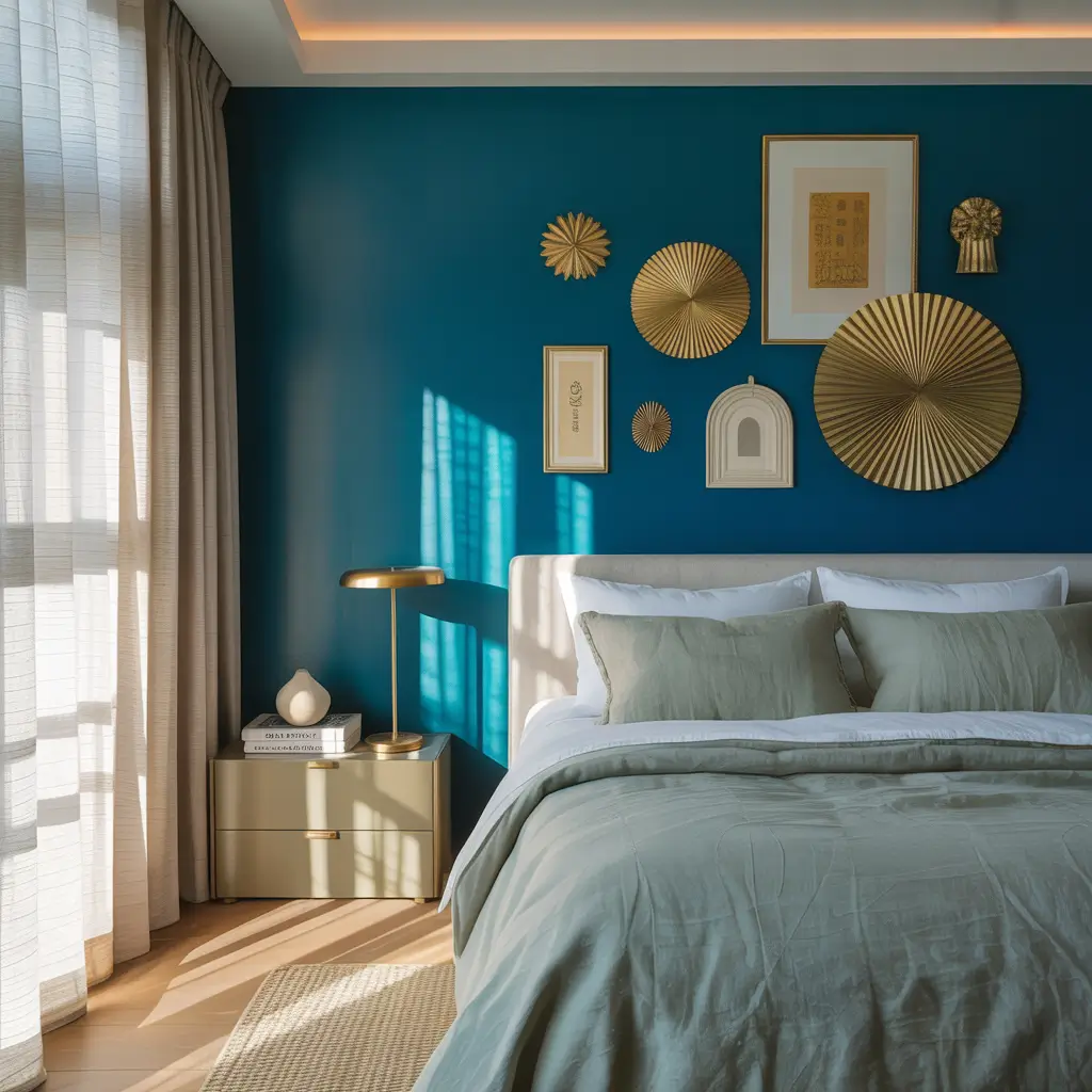 Position your peacock blue wall behind your bed as the main focal point. Then paint an adjacent wall (not opposite) in sage. The remaining walls stay neutral – white or very light gray. This creates movement and depth that a single accent wall can’t achieve.