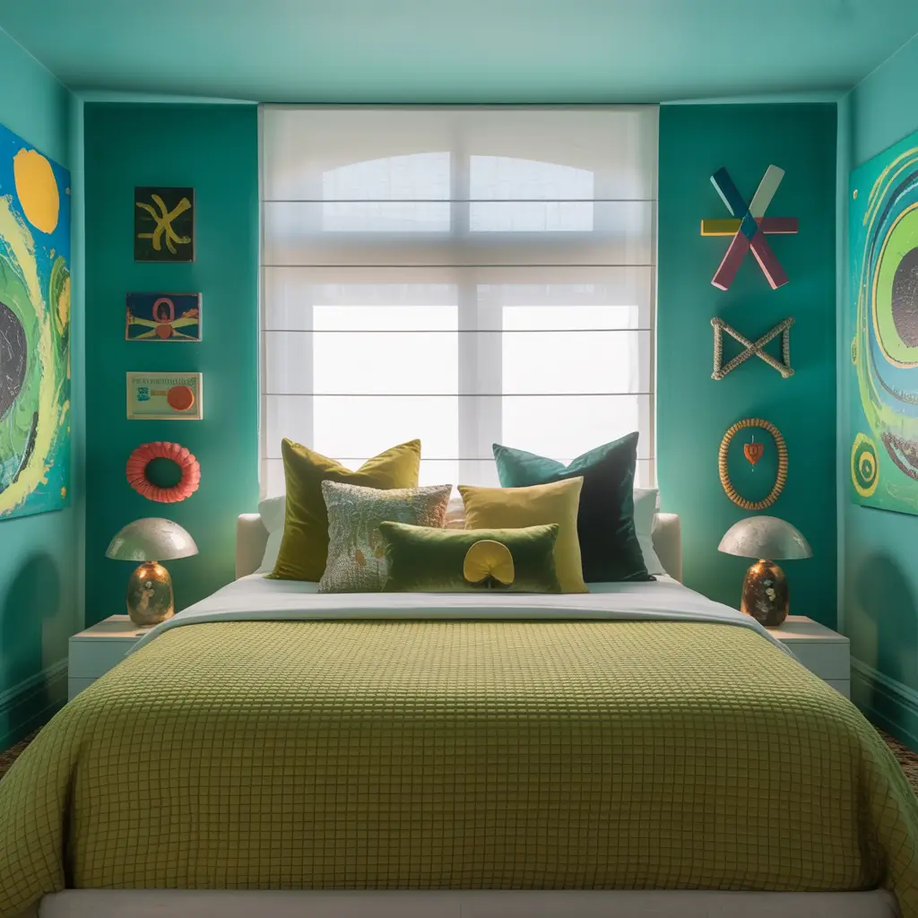 Think of your bedroom as a gallery space. Maybe aqua walls with chartreuse appearing in large-scale artwork, or chartreuse walls with aqua furniture pieces. The artistic approach means you can play with unconventional placement – why not paint the ceiling aqua and keep chartreuse at eye level?