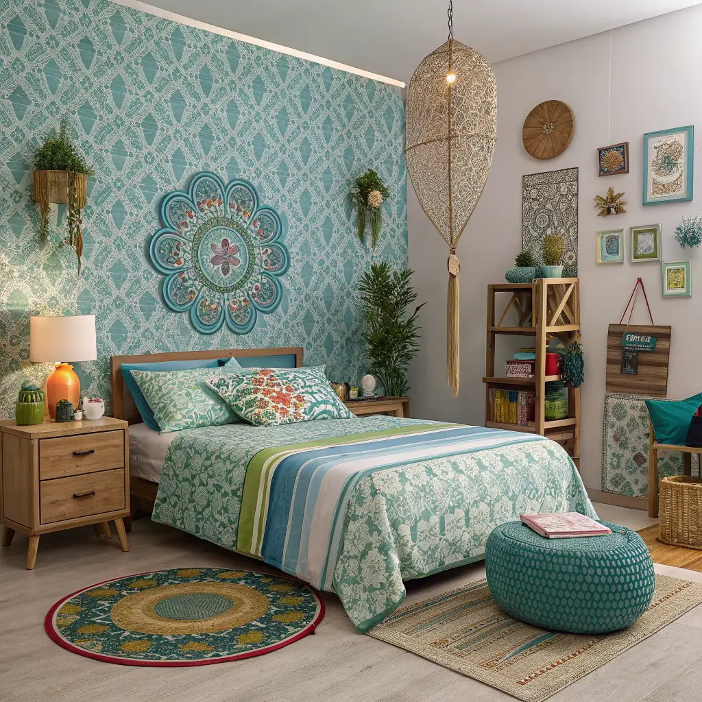 Artistic Patterned Blue and Green Bedroom
