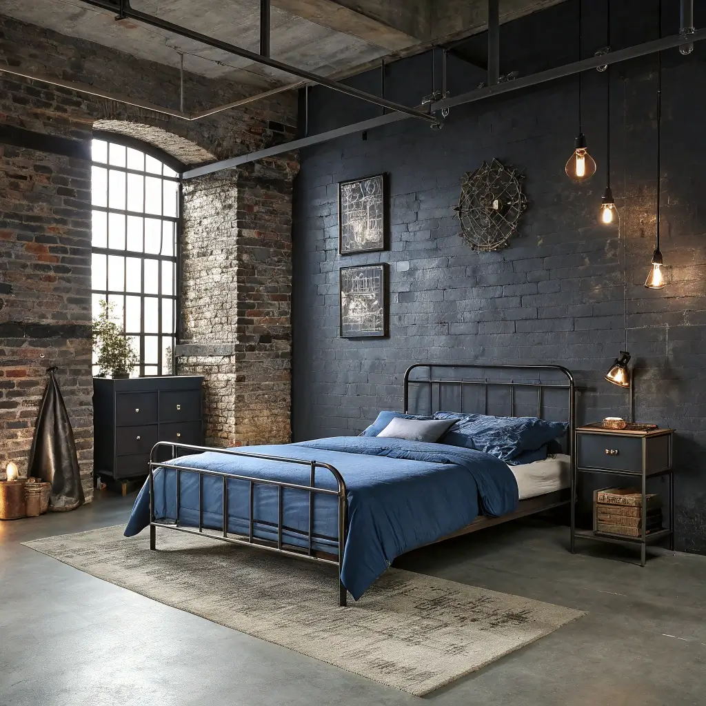 Raw materials are your best friend here. Think concrete-look walls (there’s paint for that), metal lighting fixtures, and reclaimed wood furniture. The blue comes in through denim-colored bedding, steel blue curtains, or industrial artwork featuring blue tones.