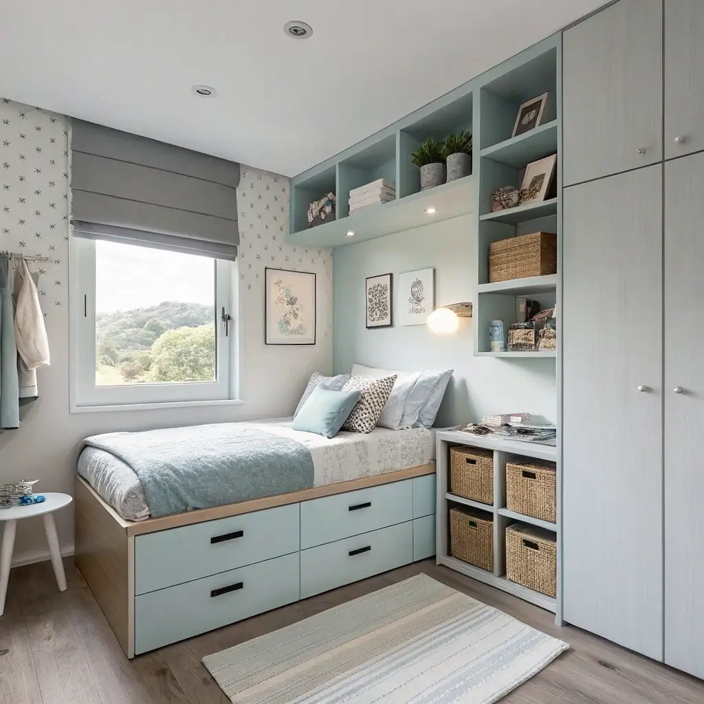 Small Space Blue and Grey Bedroom Solutions
