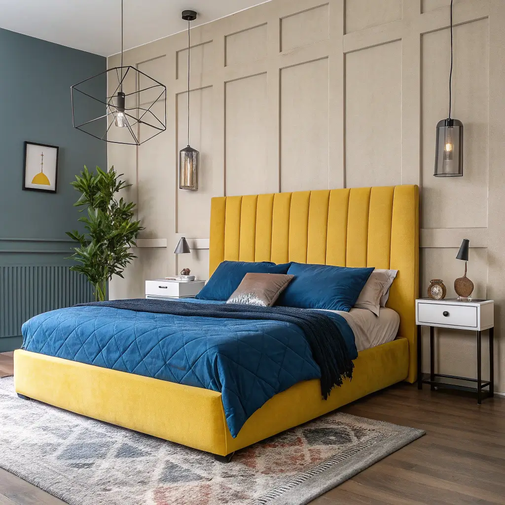 I DIY’d a yellow velvet headboard last month (easier than you’d think, FYI), and paired it with navy bedding and white walls. The contrast is chef’s kiss. Every morning feels cheerful now, even on Mondays. The yellow headboard acts like sunshine, while the blue bedding keeps things grounded and calm.