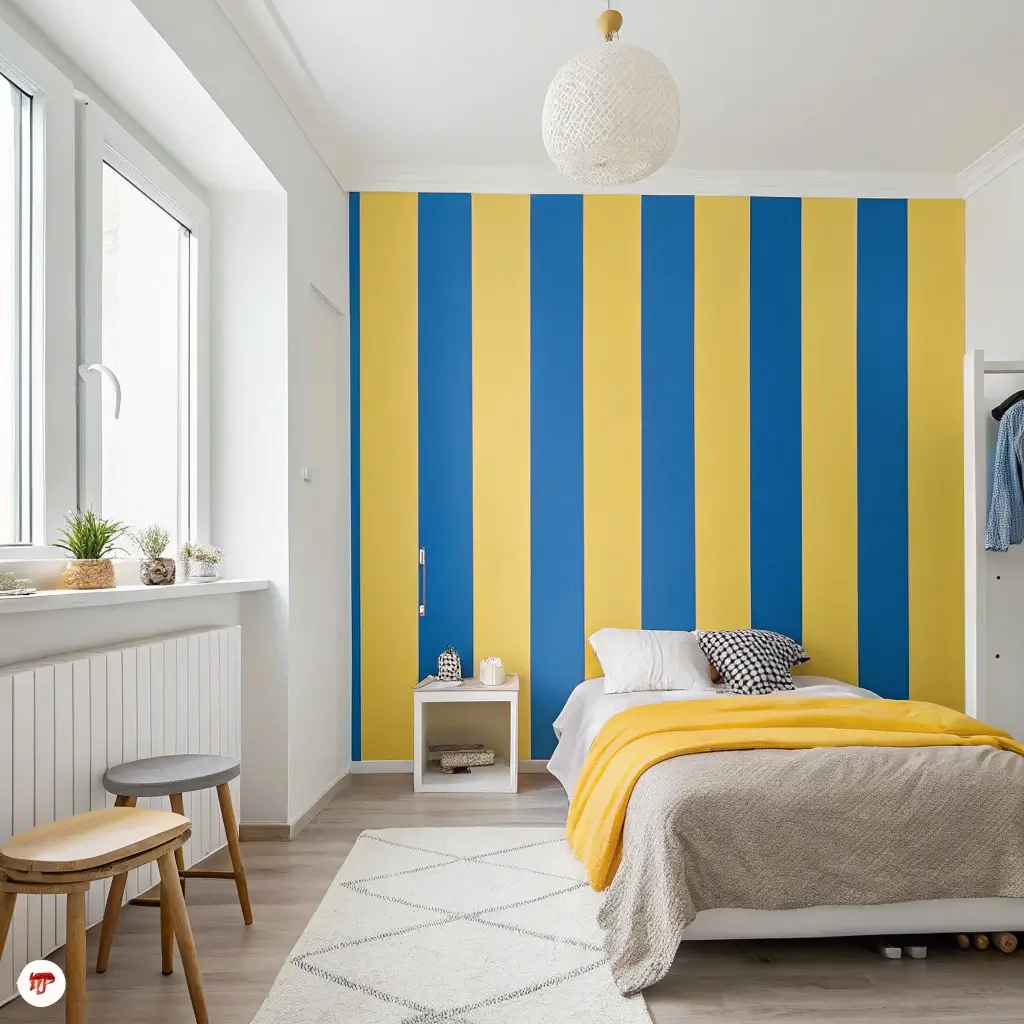 Stripes never go out of style – they just get reinvented. A blue and yellow striped accent wall adds instant personality without overwhelming your space. It’s preppy meets playful, classic meets contemporary.