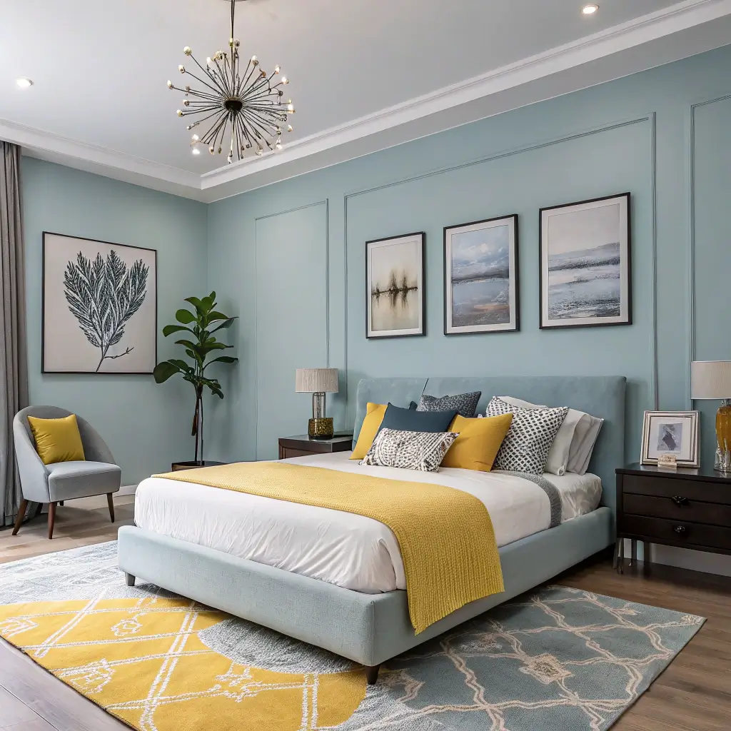 Contemporary Blue and Yellow Art-Focused Bedroom