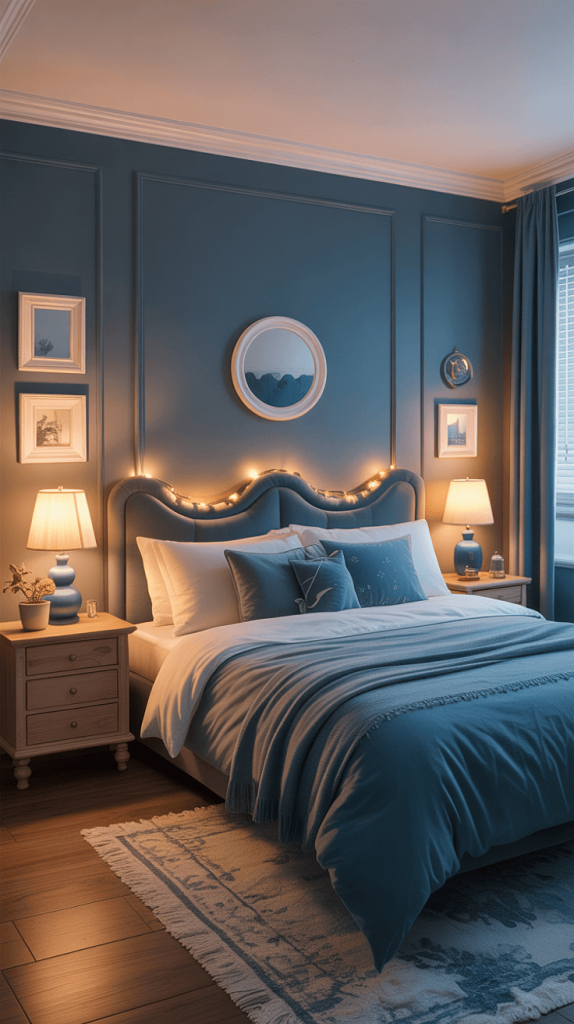 15. Create a Cozy Blue Bedroom with Soft Lighting