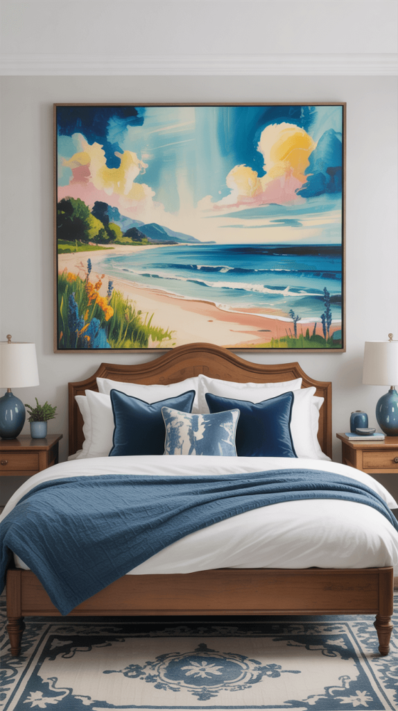 - Vases, Books, and Trinkets: Style your shelves or nightstands with blue-bound books, a ceramic vase, or a small piece of art.