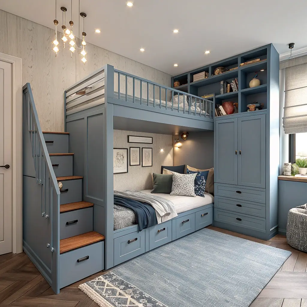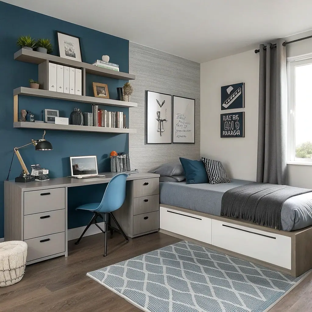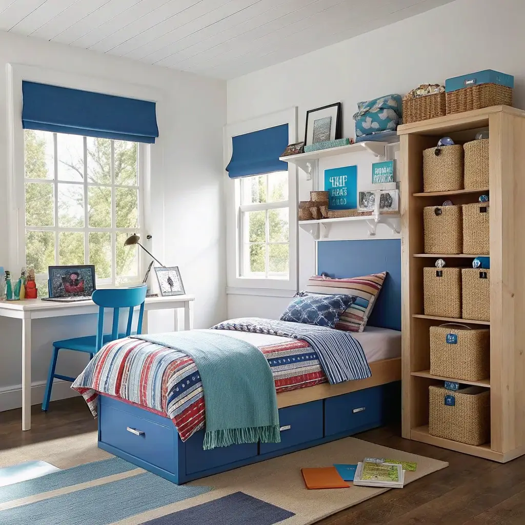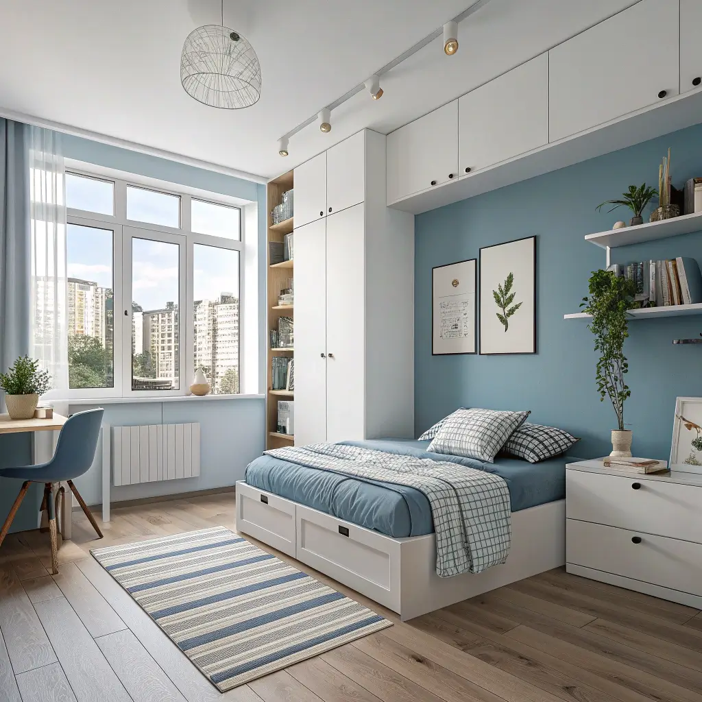 The key here is maximizing every single inch. Think vertical storage, under-bed drawers, and wall-mounted everything. I once helped design a room that was barely 8×10 feet, and we managed to fit a bed, desk, storage, and even a small reading nook. How? Smart furniture choices and strategic use of blue to create visual flow.