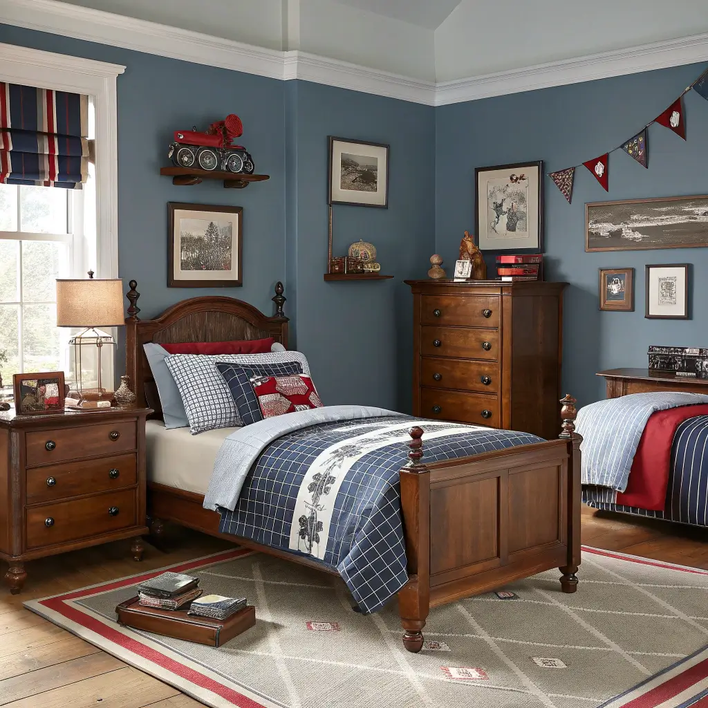 Vintage style is surprisingly perfect for boys’ rooms. Think classic aviation, retro cars, or old-school baseball themes with weathered blue as your base color.