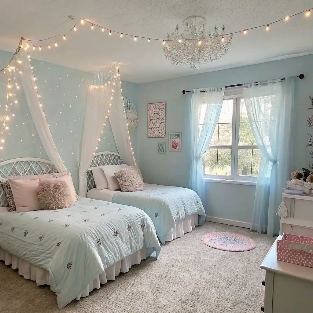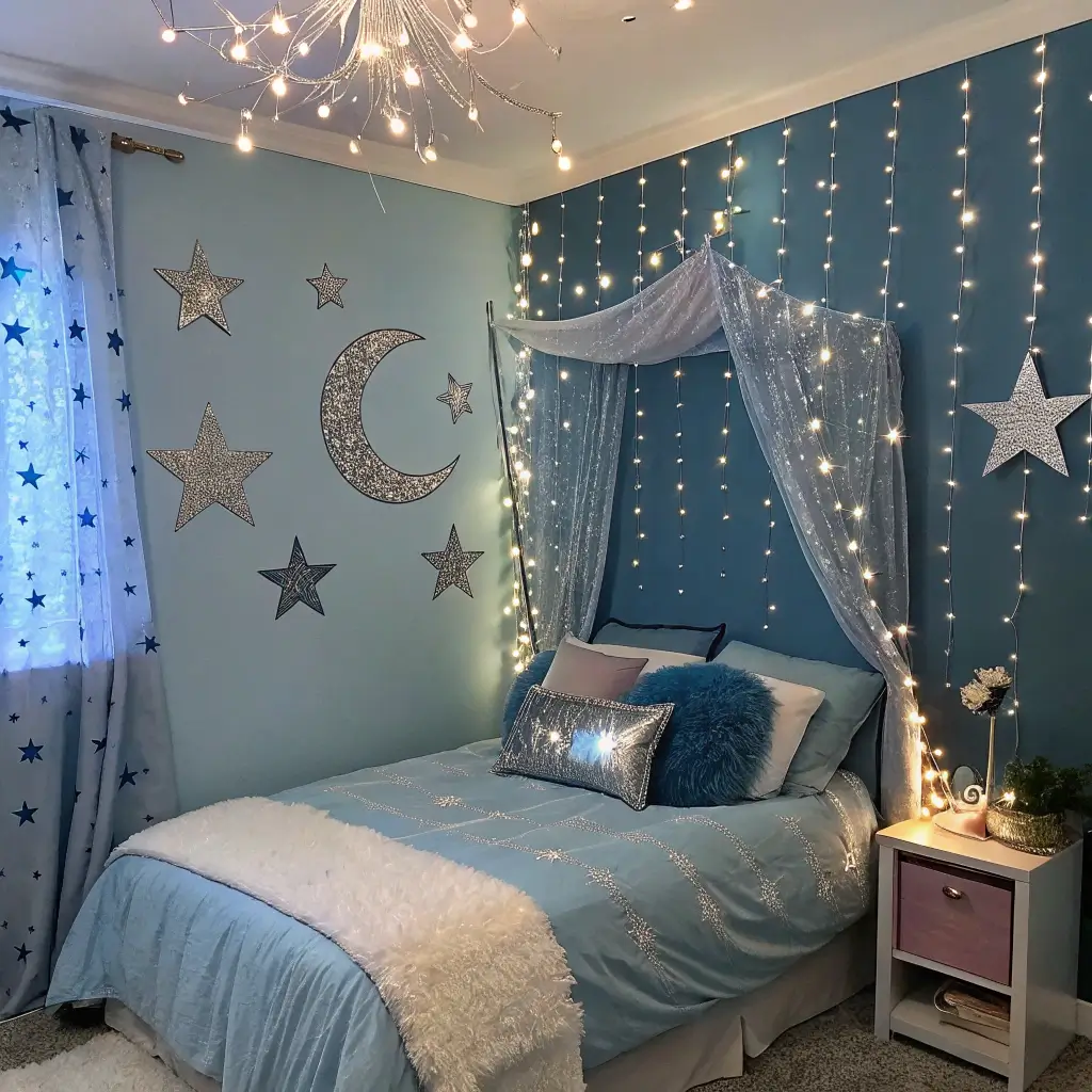 Use various shades of blue from ice to navy, then add silver through mirrors, furniture hardware, and lighting fixtures. The metallic element adds sophistication while maintaining that magical feel kids love.