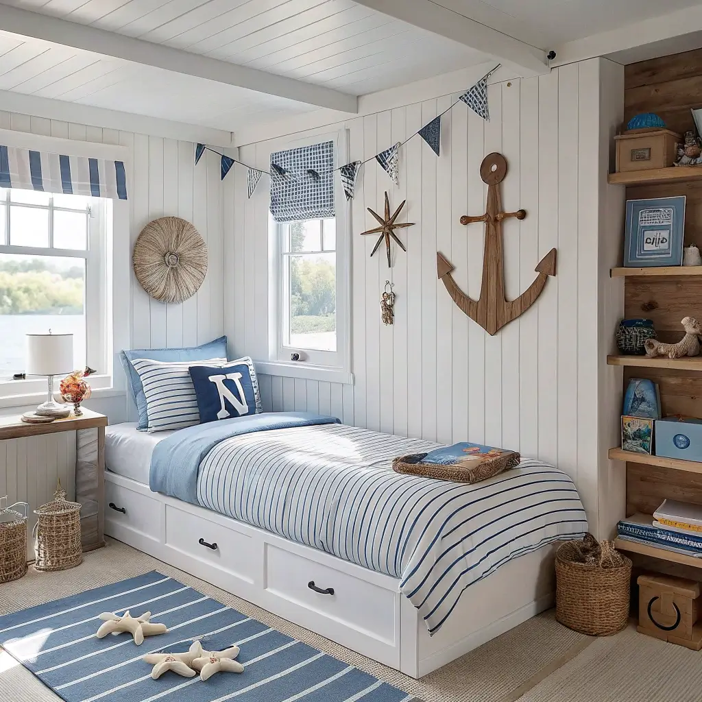 Navy blue and crisp white stripes form the foundation of this theme. But here’s where it gets interesting – instead of going overboard (pun intended) with anchors and ships, we keep it subtle. Think rope details on mirror frames, a few strategically placed starfish, and maybe one statement piece like a ship wheel clock.