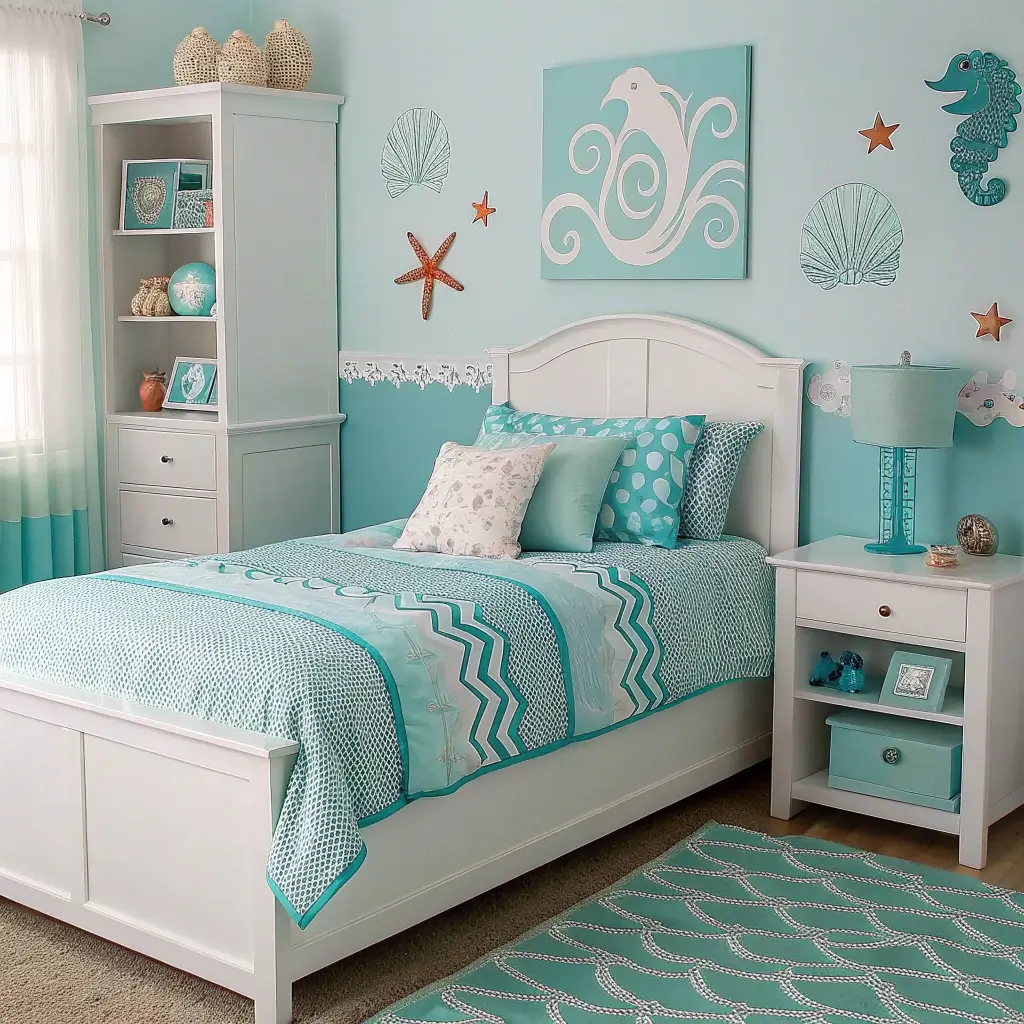 Start with an ombre wall treatment – darker blue at the bottom gradually lightening toward the ceiling. It creates this amazing underwater effect that never gets old. Add some wall decals of sea creatures, but choose artistic renderings rather than cartoon characters for longevity.