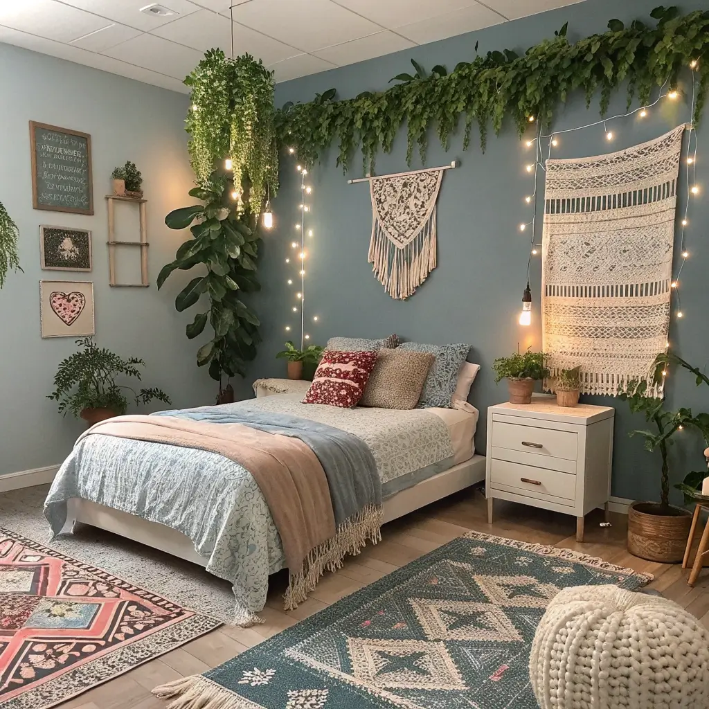 Start with a dusty blue or denim blue base, then go crazy with textiles. Macramé wall hangings, patterned throw pillows, and a mix of rugs create that collected-over-time look. Don’t match everything perfectly – that’s not what boho is about.
