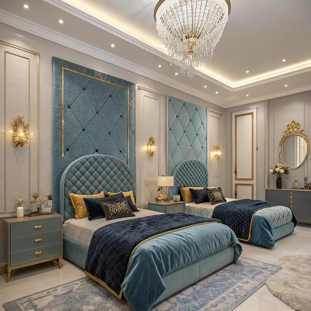 Create focal points with silver-framed mirrors or a stunning silver ceiling fixture. Add texture through silver sequined pillows or a metallic pouf. The combination of matte blue walls with shiny silver accents creates visual interest that never gets boring.