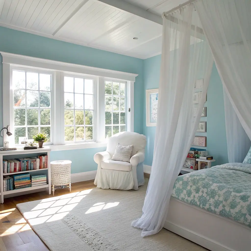 Paint the walls in a soft sky blue – something that reminds you of a perfect spring day. Keep all the trim, ceiling, and furniture white for maximum impact. The contrast creates visual interest without overwhelming the space.