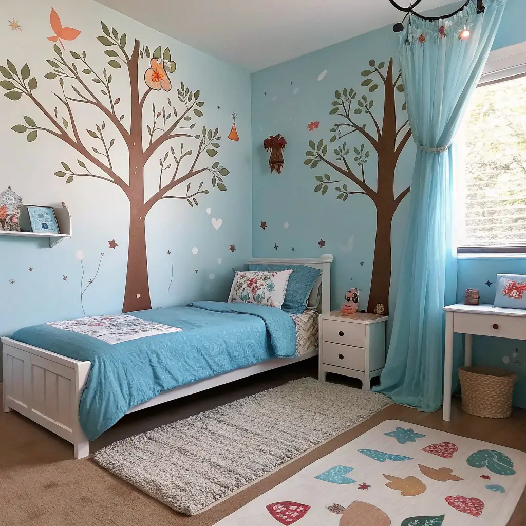 Start with a feature wall – either hand-painted trees or a stunning forest wallpaper in blue tones. The other walls should be a complementary lighter blue to prevent the room from feeling too dark. Add wooden furniture pieces to ground the theme in nature.