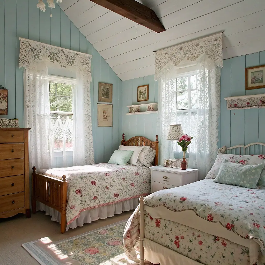 Add vintage-inspired accessories like old books, mason jar lights, and antique picture frames. A vintage quilt in blue and white makes the perfect bedspread. Don’t forget the window treatment – café curtains or roman shades in a delicate pattern complete the cottage feel.