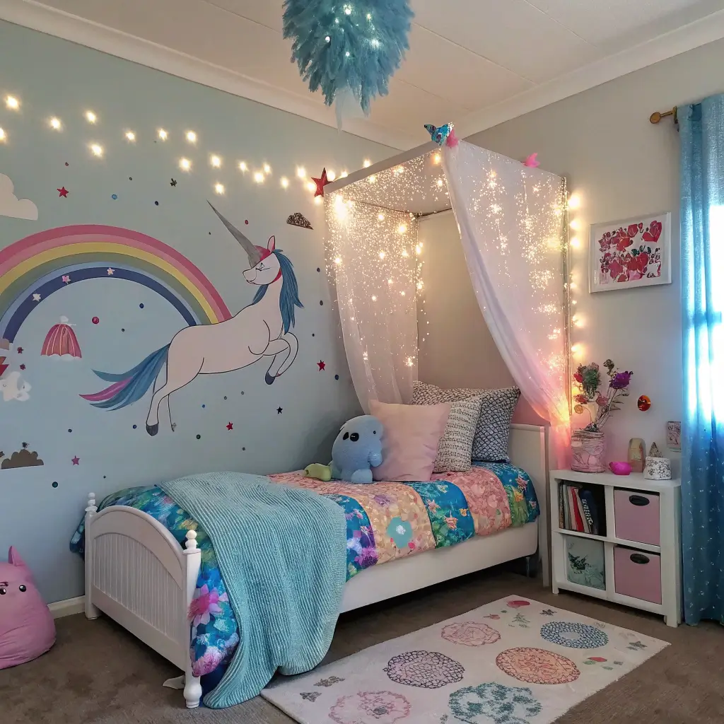 Paint the walls in a soft, shimmery blue (add a tiny bit of pearl finish to regular paint for that magical effect). Instead of rainbow everything, stick to a blue, purple, and silver color scheme with touches of iridescent elements.