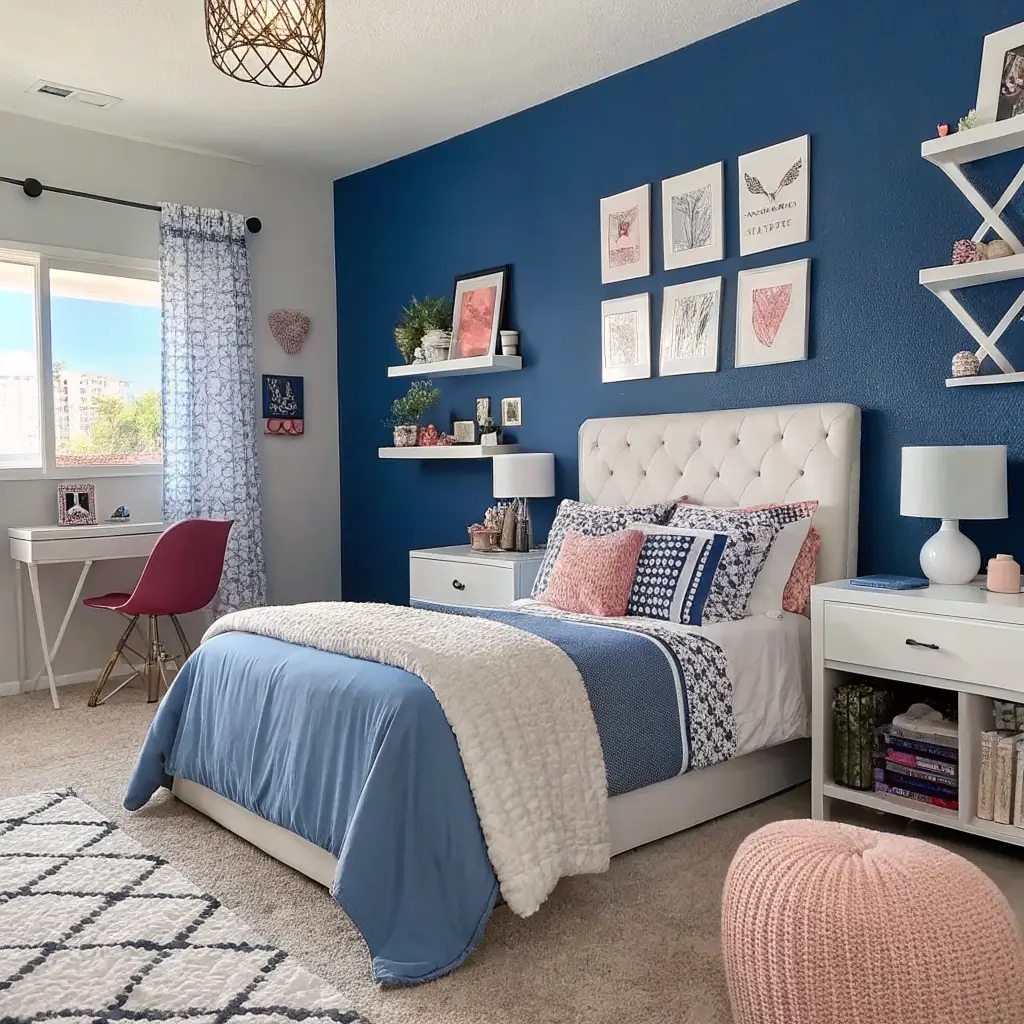 Keep furniture simple and let the wall color be the star. Add personality through artwork, photos, and accessories. String lights in geometric patterns, bold graphic prints, and metallic accents all work beautifully with royal blue. IMO, this is the perfect compromise between teen independence and parental approval.