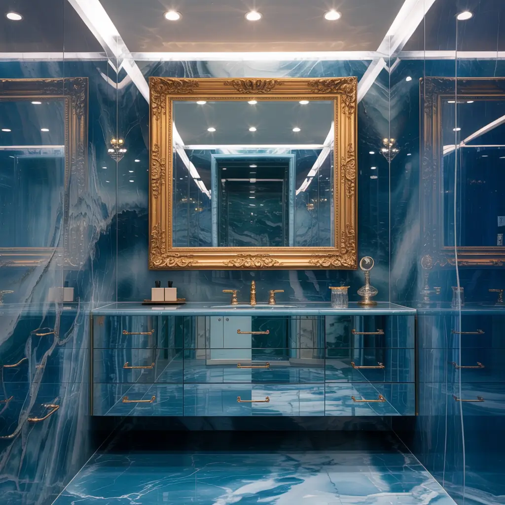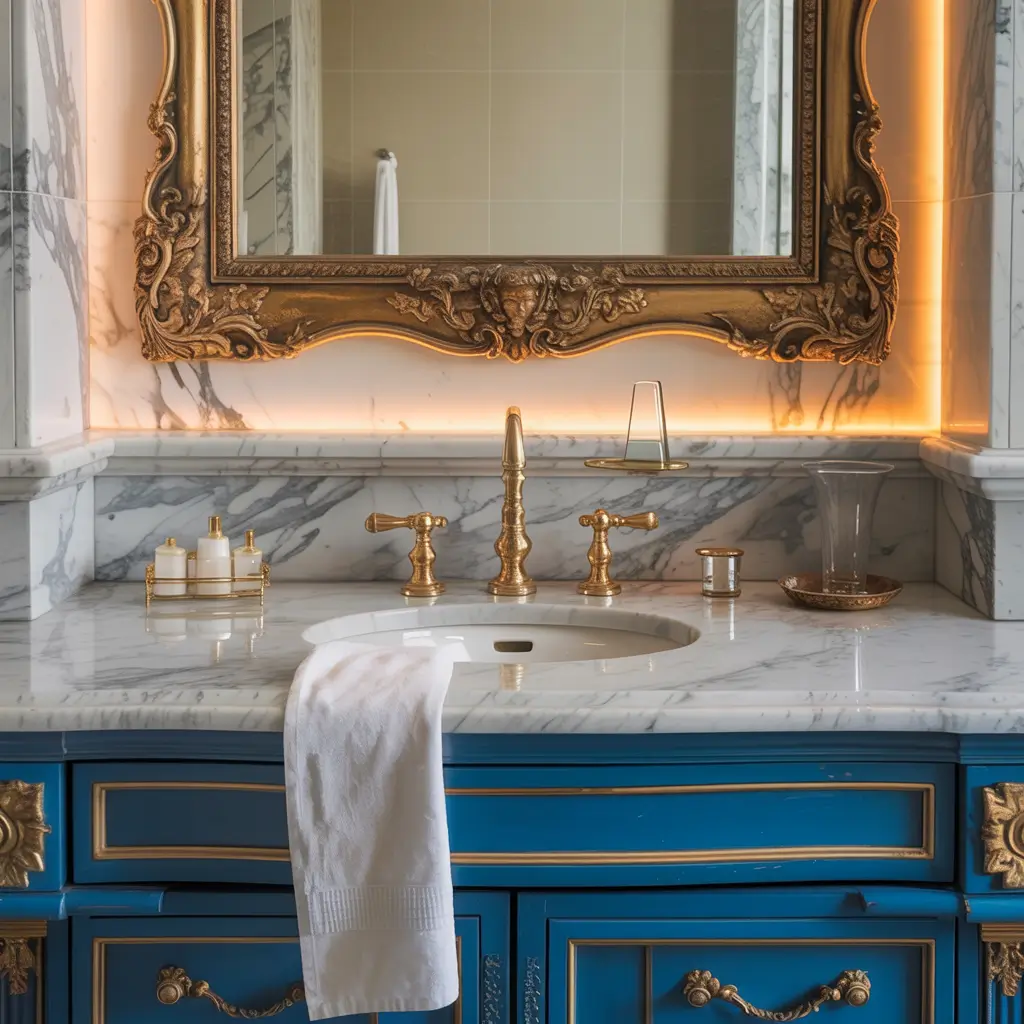 Okay, this combo makes me weak in the knees every single time. Blue marble paired with gold fixtures creates this rich, luxurious atmosphere that feels both classic and trendy. We’re talking brushed gold faucets, gold-framed mirrors, and maybe even gold cabinet hardware if you’re feeling extra.