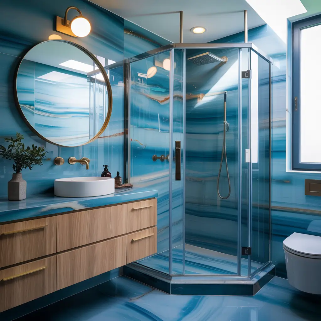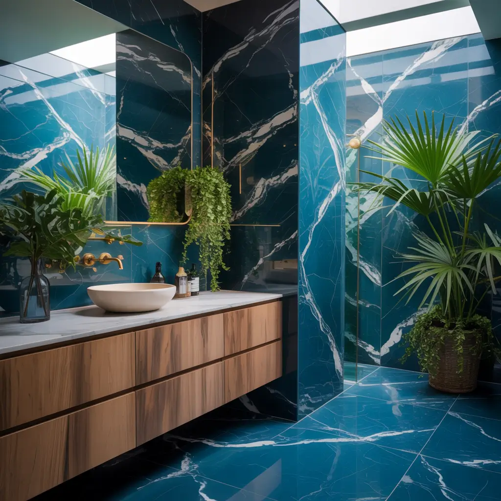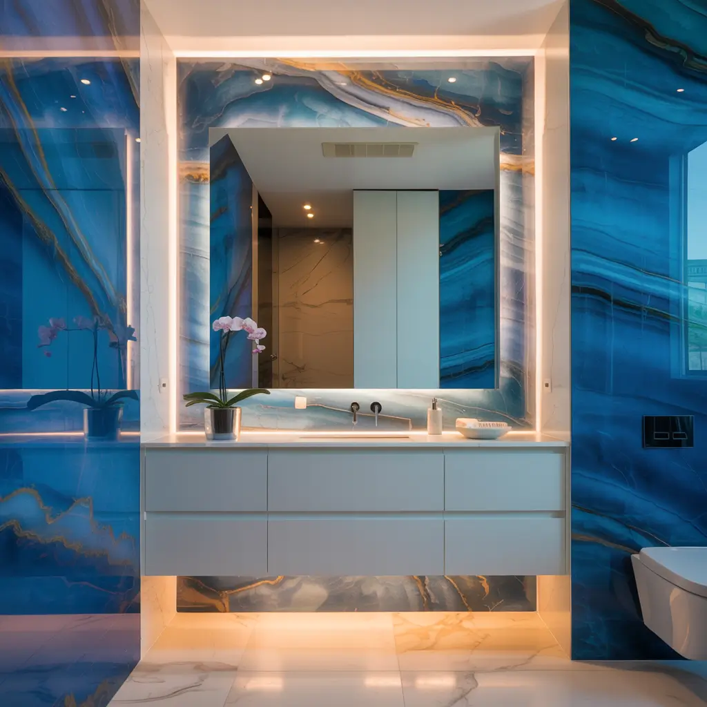 Here’s the thing about blue marble: it hits different than your typical white Carrara. Blue marble brings drama, sophistication, and a touch of unexpected luxury that makes even the most mundane morning routine feel like you’re getting ready at a five-star resort.