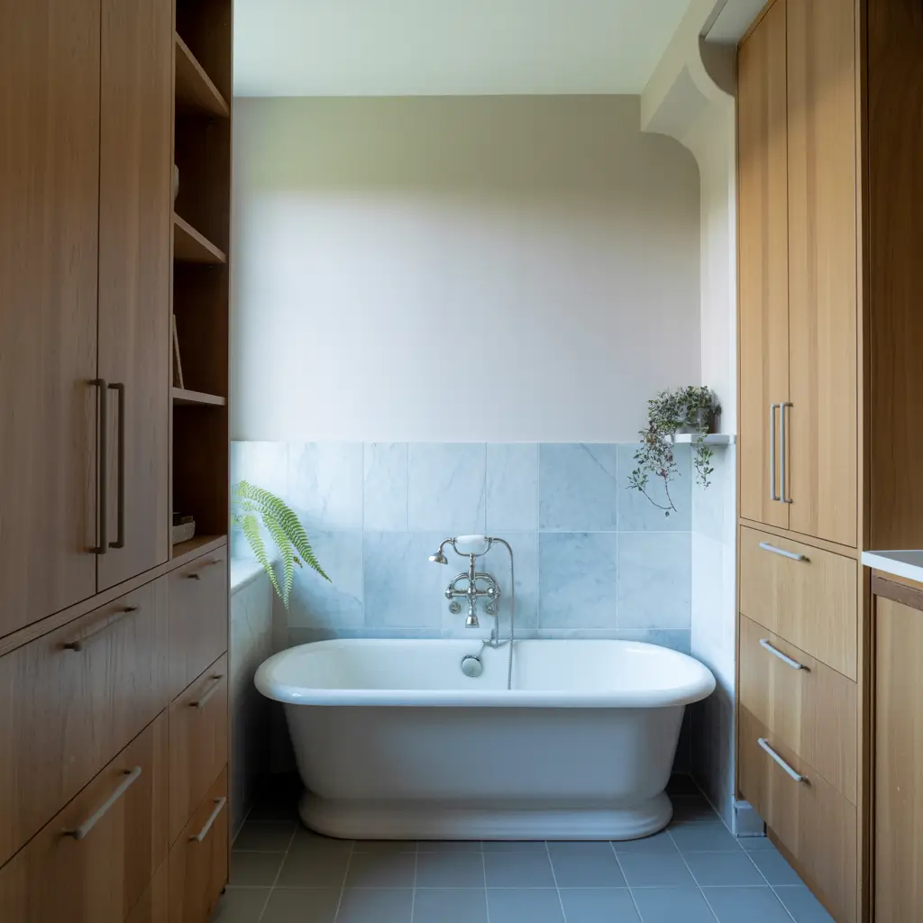 - Brass or gold fixtures create warmth against cool blue tones