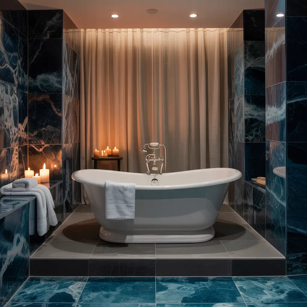 But here’s where people mess up – they stop at the floor. Why not extend that blue marble up the wall behind the tub? Create a stunning backdrop that frames your bathing experience. I’ve seen installations where the marble continues halfway up, topped with a floating shelf for candles and bath products. Practical AND gorgeous? Yes, please.
