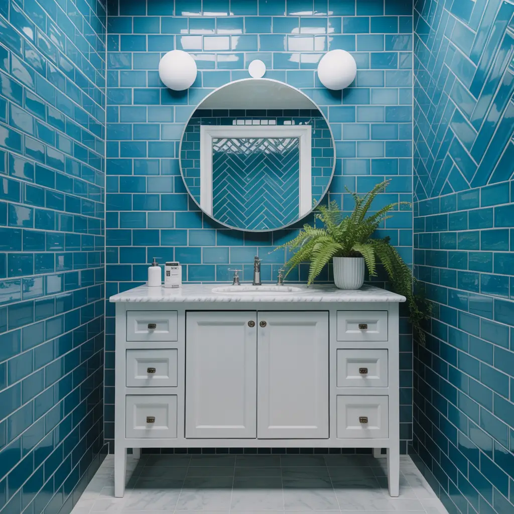 The key is going all-in with confidence. Cover one full wall in bright cobalt or cerulean blue subway tiles, then keep everything else white and minimal. This creates a jewel box effect that makes your small bathroom feel like a deliberate design choice, not a compromise.