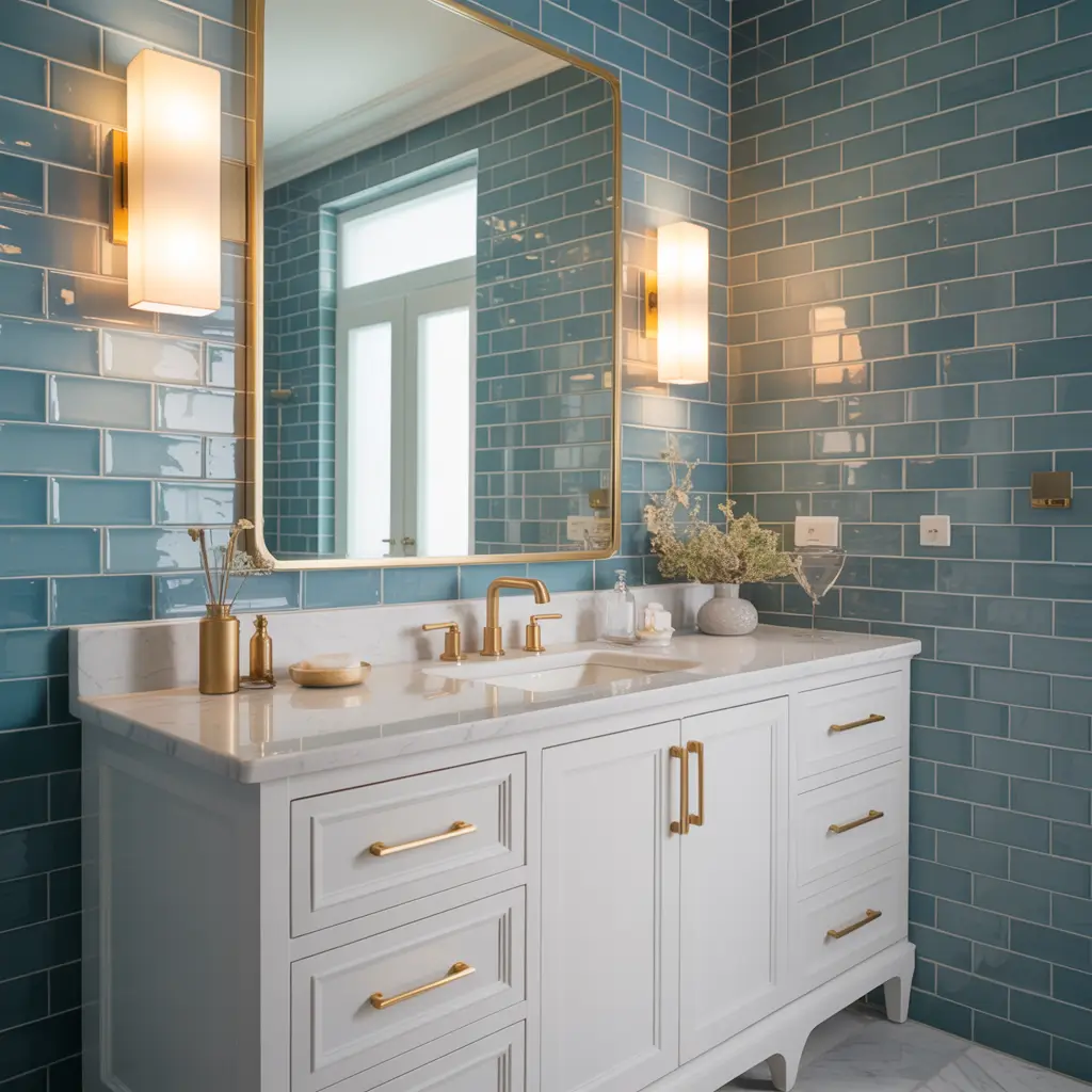 I recently splurged on gold fixtures for my blue-tiled guest bathroom, and honestly? Worth every penny. The warmth of the gold softens the coolness of the blue, creating this perfect balance that feels inviting rather than cold.