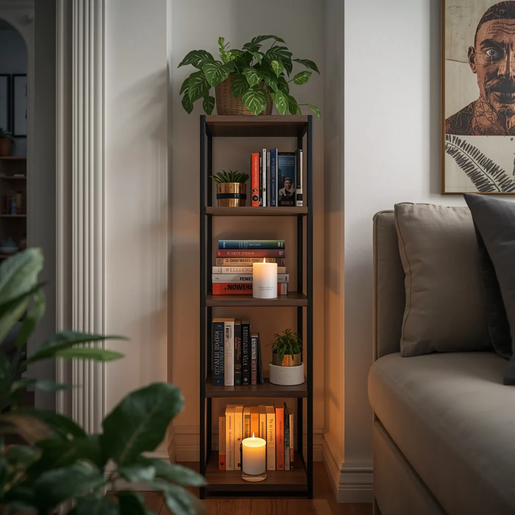 Corner shelves changed my life – seriously. That awkward corner that serves no purpose? Perfect spot for a ladder shelf or floating corner unit. I squeezed an entire library into my 500-square-foot apartment using corners alone.