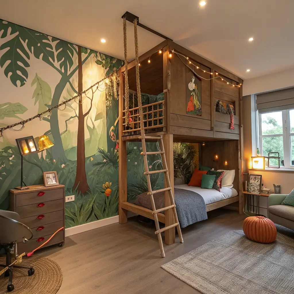 Start with a tent-style bed canopy or an actual indoor camping tent. My friend Sarah set up a small pop-up tent in her son’s corner, and now he reads there every night with a flashlight – voluntarily! Add some rope details on the walls, maybe a climbing wall if you’re feeling ambitious, and suddenly you’ve got base camp right in your home.