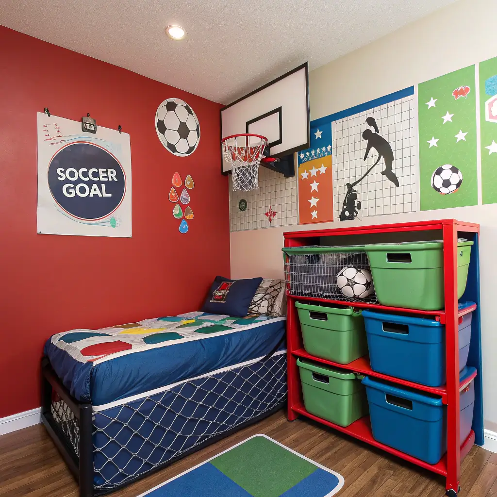 Display jerseys in frames instead of letting them pile up on the chair. Install floating shelves shaped like baseball bats or hockey sticks for trophies and memorabilia. A basketball hoop over the laundry hamper? Genius move that actually encourages picking up dirty clothes.