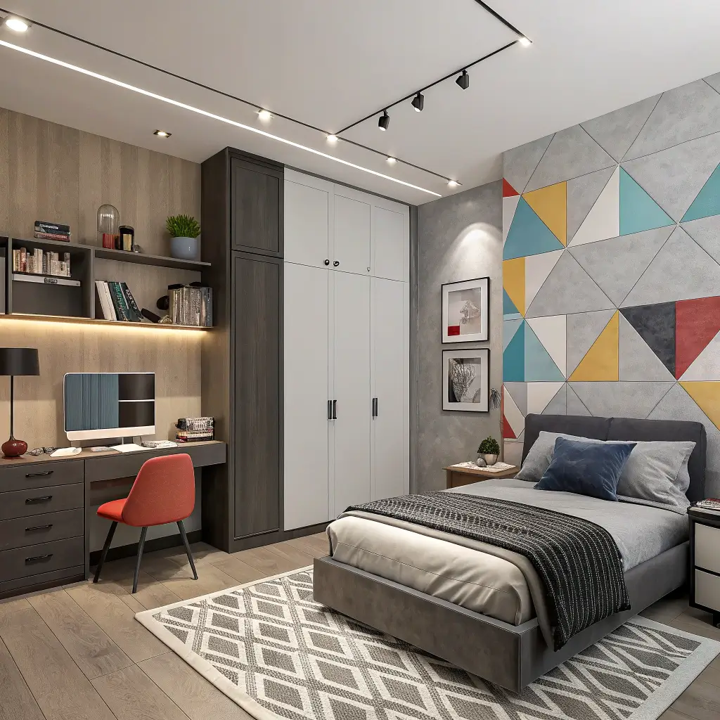 Monochromatic color schemes with pops of bright accent colors keep things sophisticated. Black and white photography, geometric patterns, and industrial-style furniture create a mature look that still feels age-appropriate.