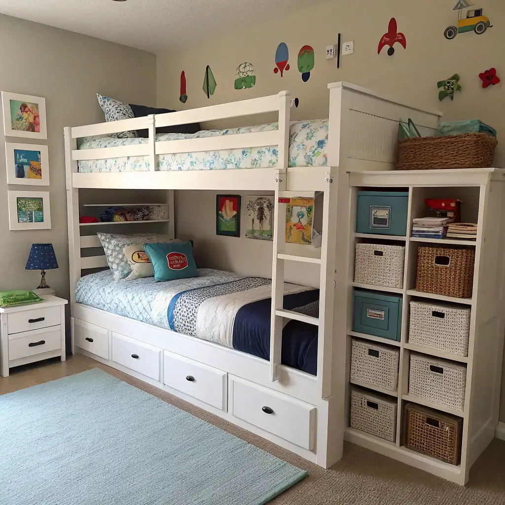Bunk beds save space, but consider L-shaped configurations for more privacy. Each boy needs their own storage, desk area, and personal display space. Color-code everything – blue bins for one, red for the other. Simple system, fewer arguments.