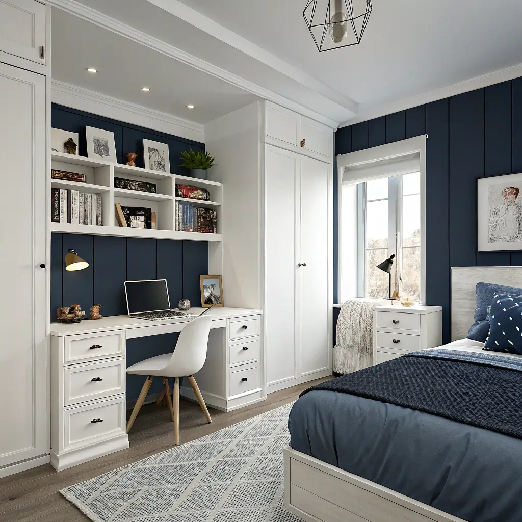 Start with crisp white walls (yes, I know, white with kids sounds insane, but hear me out). Navy accents through bedding, curtains, and furniture create contrast without darkening the room. The white walls actually make the space feel bigger and brighter, which is perfect for those cave-dwelling teenage years.