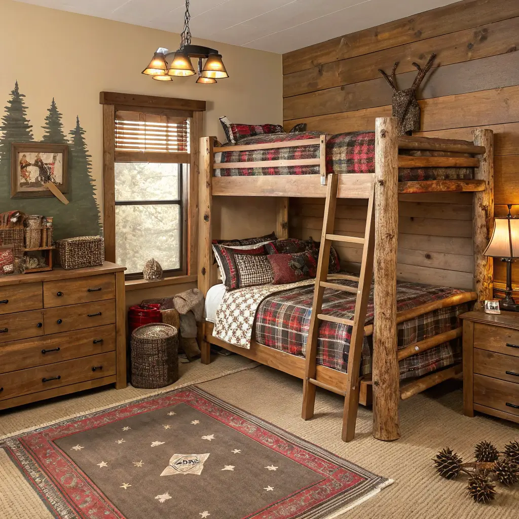 Choose a solid wood bunkbed with a natural finish. Add faux wood beam details to the ceiling if possible. The color palette includes deep reds, forest greens, and warm browns.