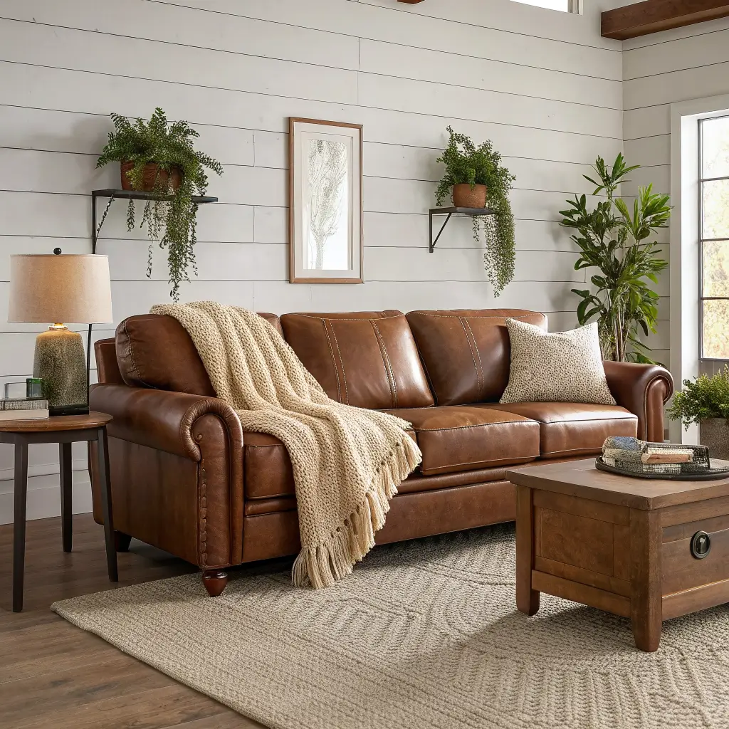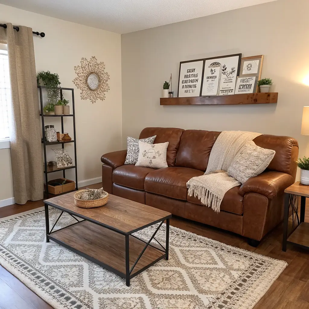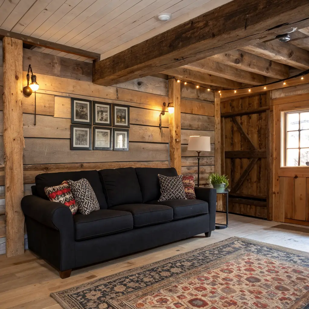 Start with those classic farmhouse elements – shiplap walls (if you’re brave enough), barn doors, or exposed beams. Your black couch grounds all that rustic charm and prevents the room from looking too cutesy. Add plaid or gingham pillows in neutral tones, and layer in some vintage quilts for that authentic farmhouse feel.