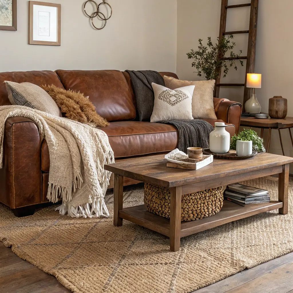 Ever noticed how black couches can sometimes feel a bit heavy in a room? Here’s my trick: layer in some lighter rustic elements like cream-colored chunky knit throws or beige linen pillows. Mix in some vintage metal accents – think old lanterns or weathered picture frames – and suddenly your black couch looks intentional, not imposing.