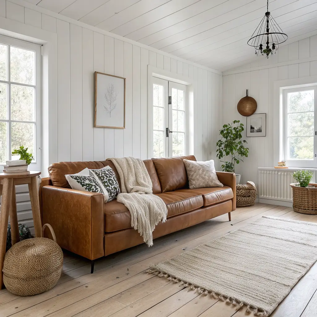 The coziness factor comes from soft lighting and natural materials. Layer in wool throws, sheepskin rugs, and maybe some potted plants. Candles are essential – group them on your coffee table or mantle for that instant hygge feeling. The black couch grounds all that lightness and adds sophisticated contrast.