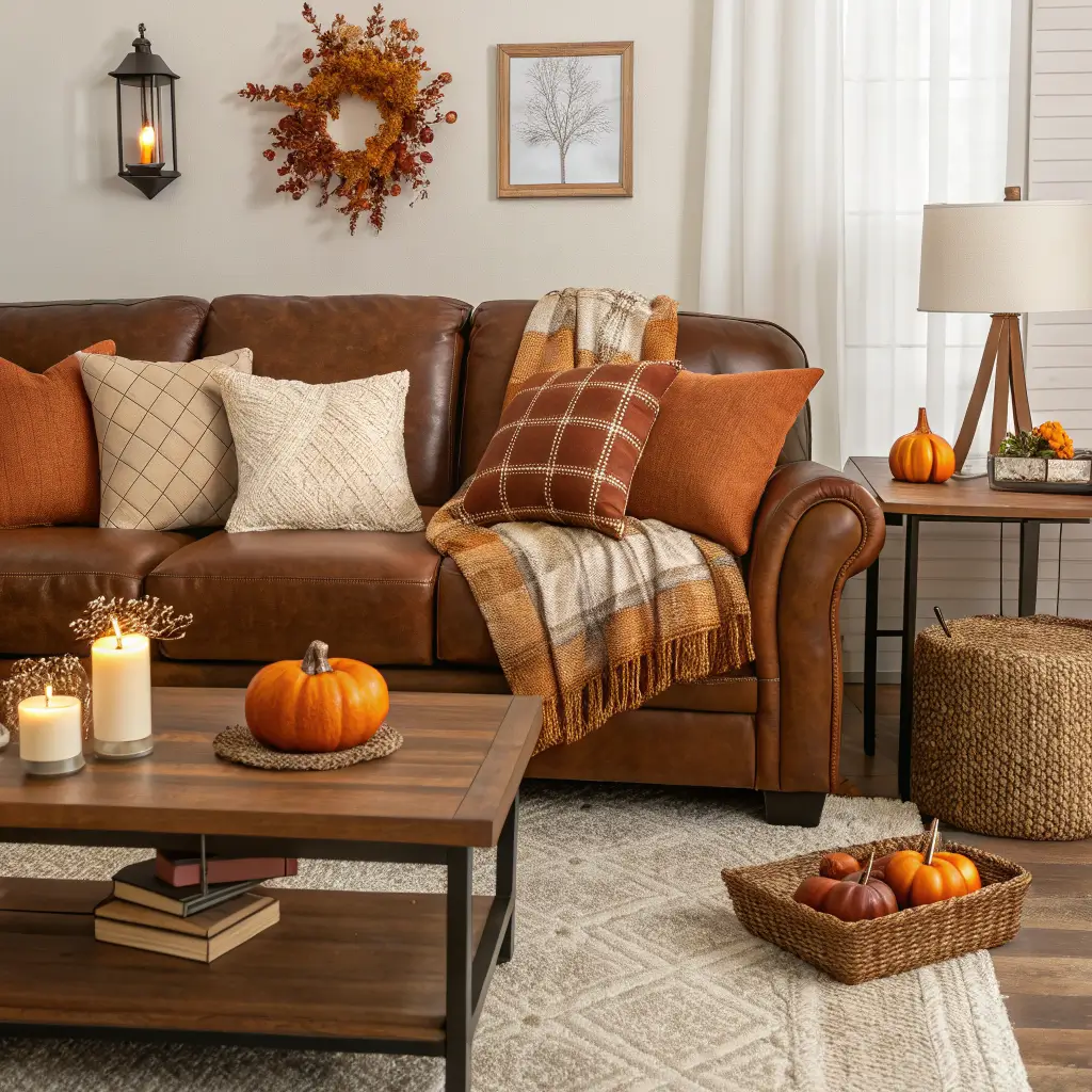 Bring in natural autumn elements – branches with fall leaves in a tall vase, pine cones in a bowl, or even some decorative gourds if you’re feeling festive. The black couch grounds all these seasonal touches and prevents them from overwhelming the space.