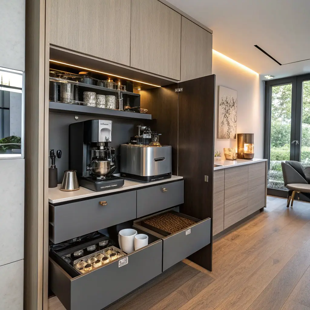 The beauty of hidden coffee bars? They work with any design style. Traditional kitchen? No problem. Ultra-modern space? Perfect. You control when your coffee obsession shows, and when it doesn’t.