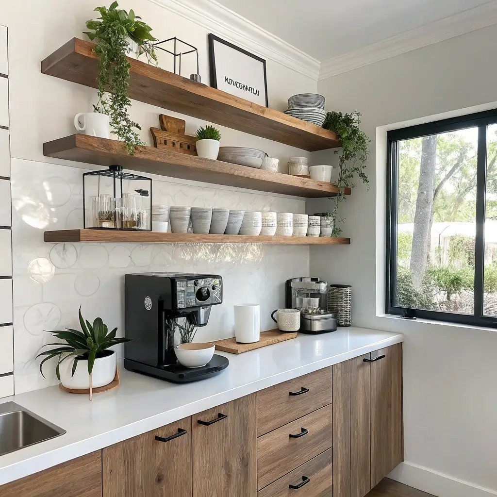 Floating shelves create an airy, open feel that makes your coffee bar feel less heavy and more artistic. You’re essentially creating a coffee gallery on your wall, displaying your beautiful mugs and equipment like functional art pieces.