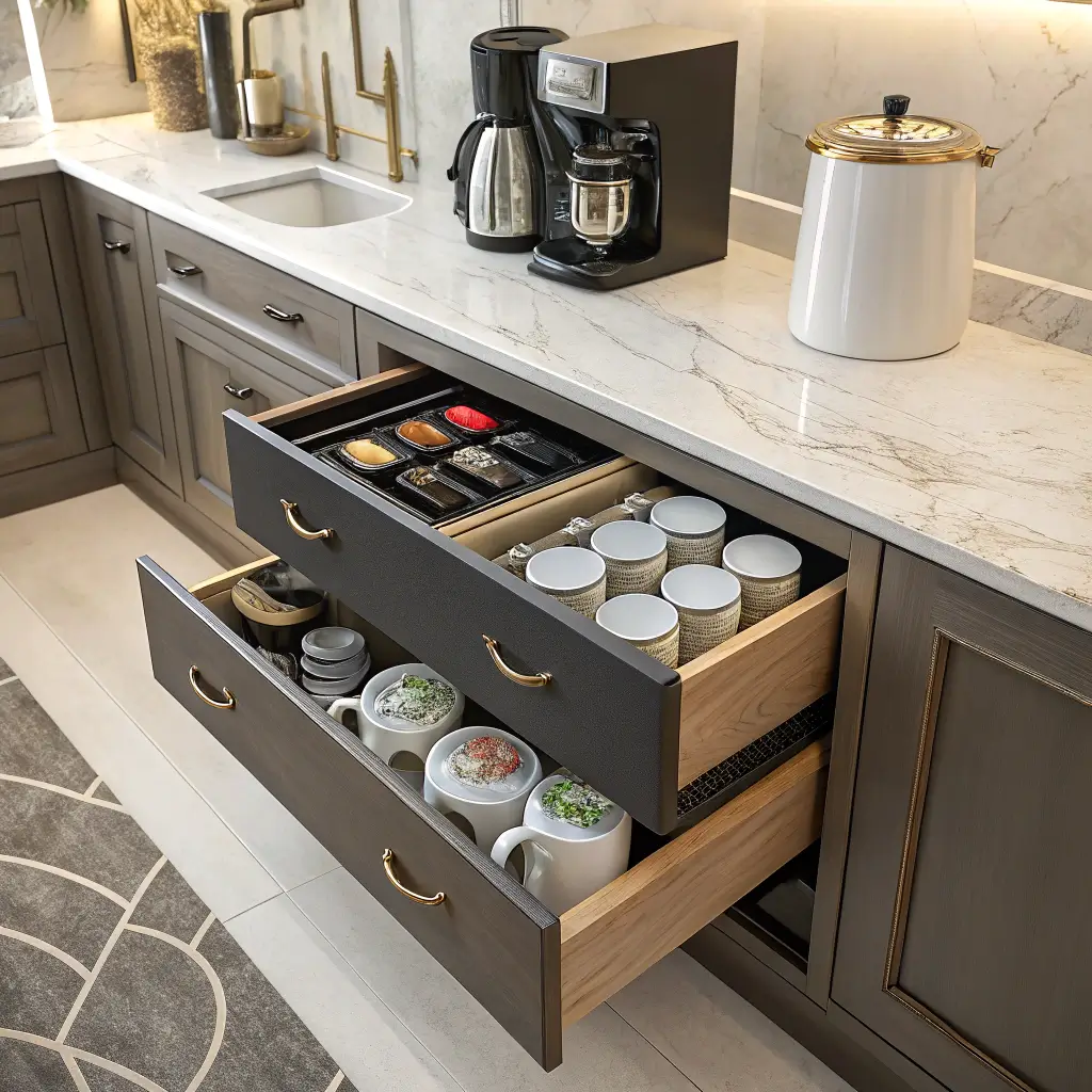 Storage drawers change everything when you’re serious about coffee organization. Forget digging through cabinets—drawer storage puts everything at your fingertips with one smooth pull. IMO, this is the most practical option for daily coffee drinkers.