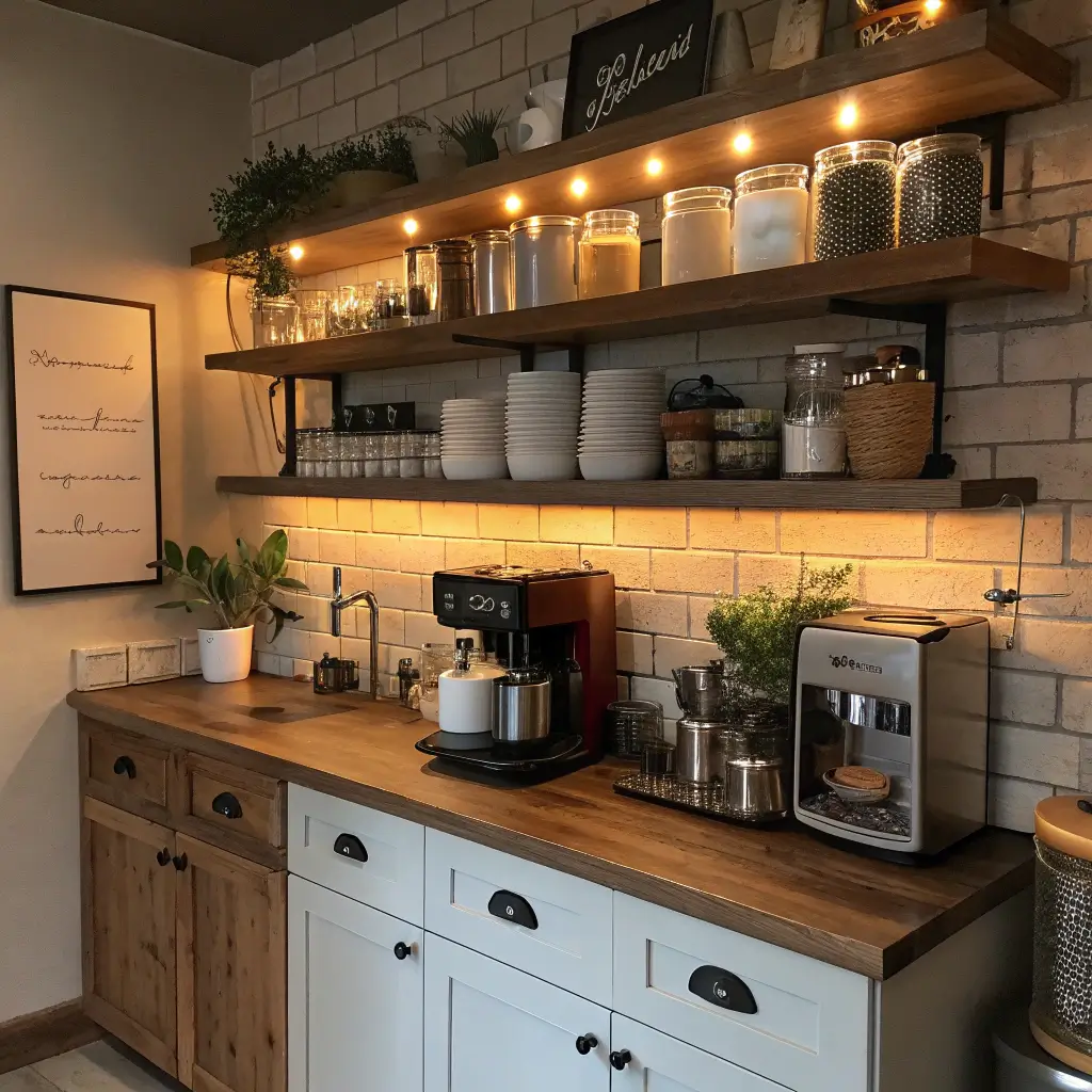 The color palette stays warm and inviting—whites, creams, soft grays, and natural wood tones. Throw in some copper accents with a vintage kettle or French press, and you’ve nailed the aesthetic. FYI, this style works amazingly well with both traditional drip coffee makers and fancy espresso machines.