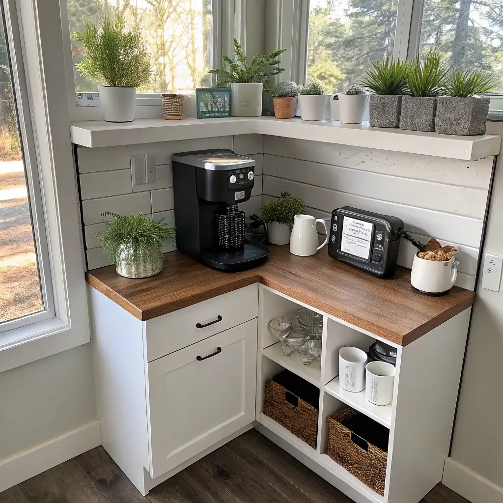 Corners often become dead space in kitchens, but they’re actually perfect for coffee stations. Corner coffee bars maximize awkward angles and turn wasted space into your new favorite spot. Plus, corners naturally create a cozy, defined area for your coffee ritual.