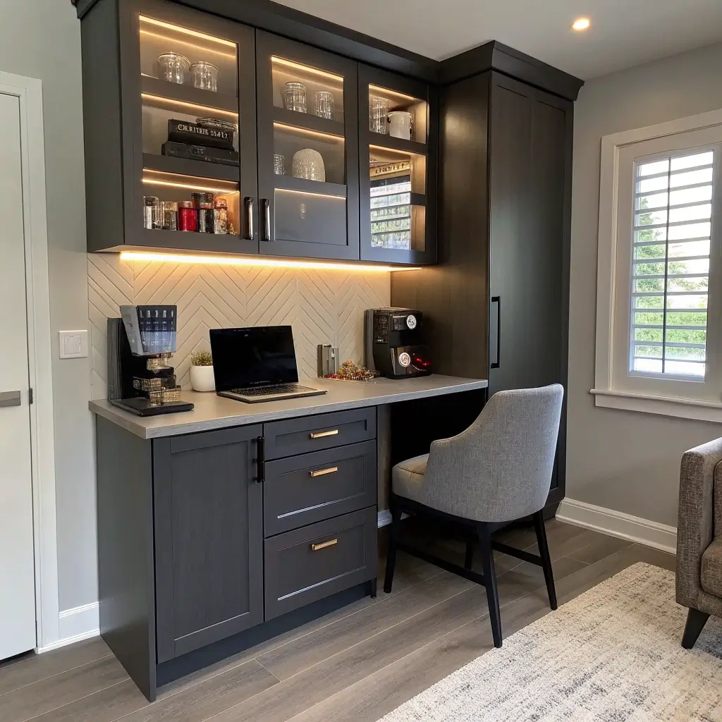 I’ve designed these combo stations with built-in charging stations, tablet holders, and even small desks that fold down from the coffee bar itself. The key is keeping both functions organized without one overwhelming the other.