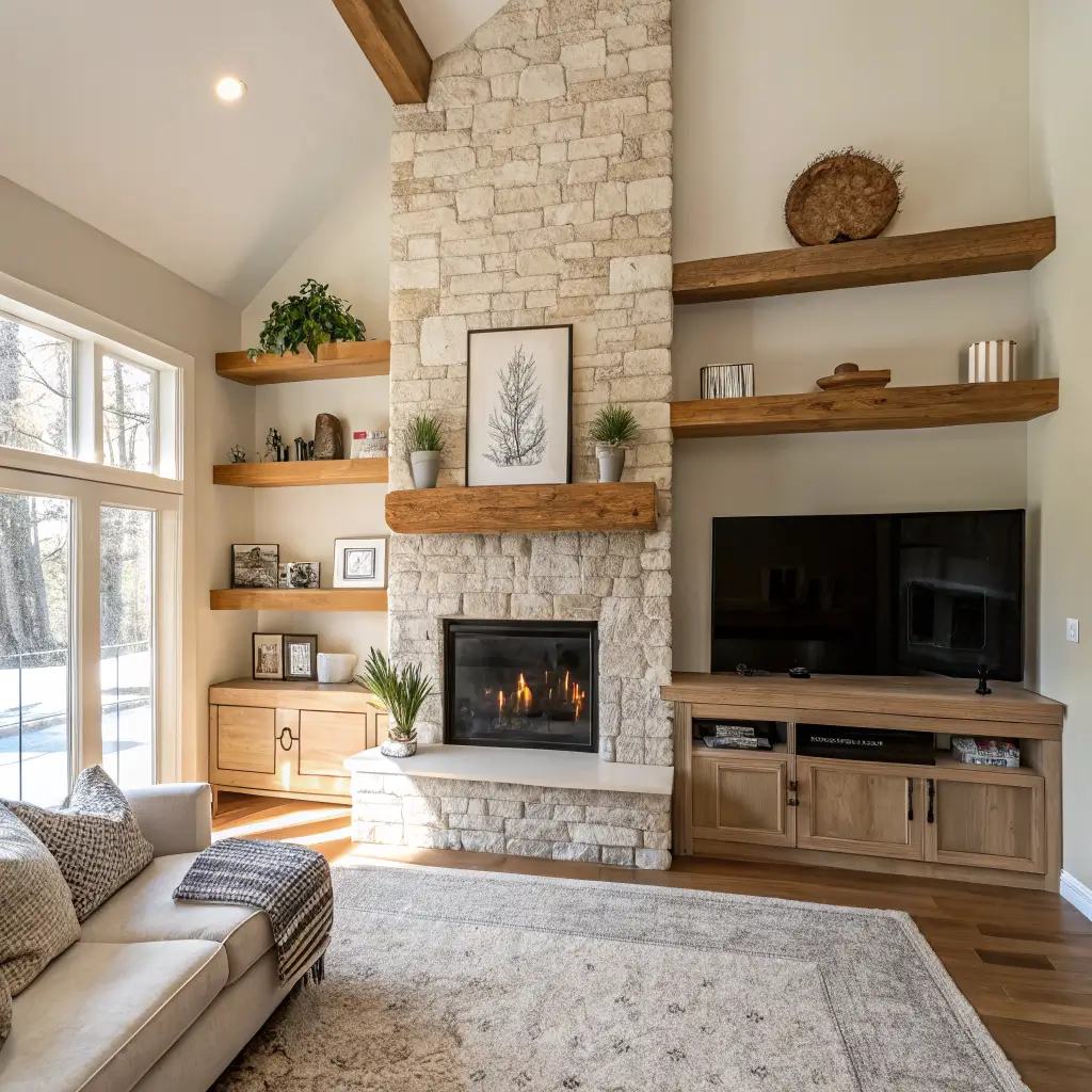 This style works especially well with modern, linear fireplaces. The clean fireplace lines anchor the design while the asymmetrical shelves add movement and energy. I’ve seen this done where shelves literally zigzag up the wall, creating this dynamic climbing effect that’s impossible to ignore.