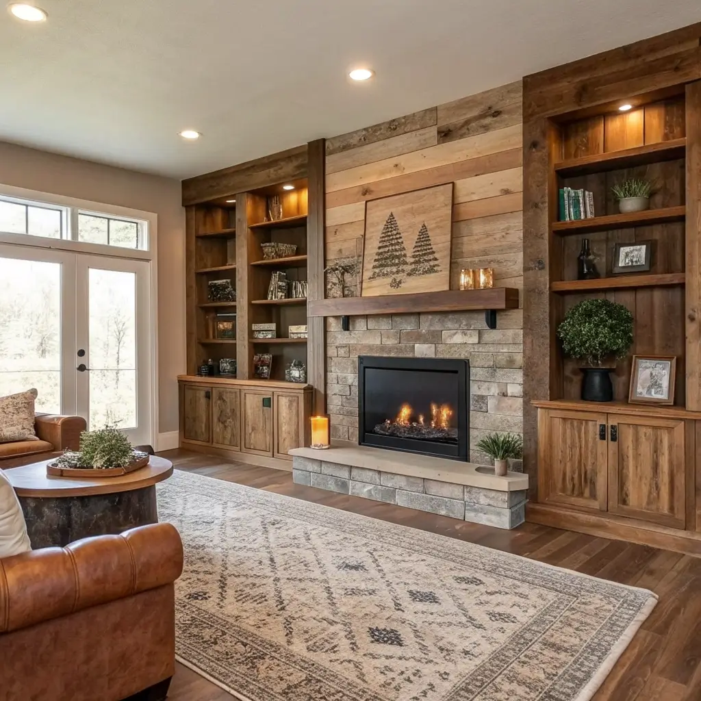 Rustic Reclaimed Wood Shelving with Fireplace Accent