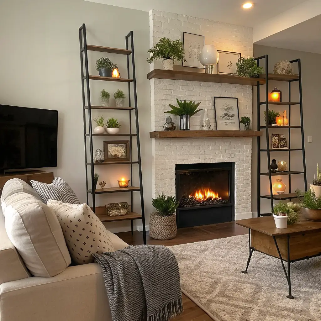 Remember those old library ladders? Now imagine that aesthetic but built into your wall. Ladder-style shelving brings this casual, accessible vibe that makes your living room feel instantly more relaxed.