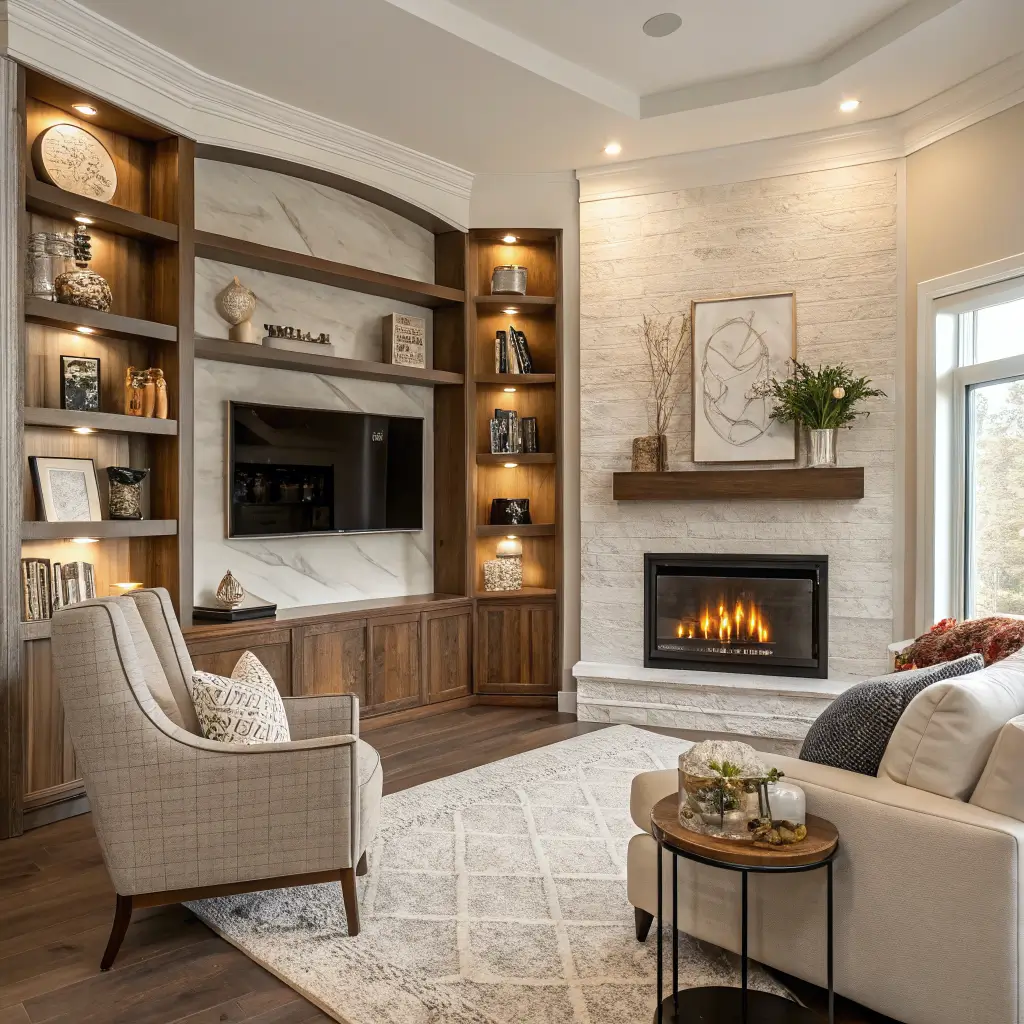 Got a corner fireplace that’s throwing off your whole furniture arrangement? Curved shelving embraces that angle and makes it the room’s best feature. Instead of fighting the geometry, you’re working with it.